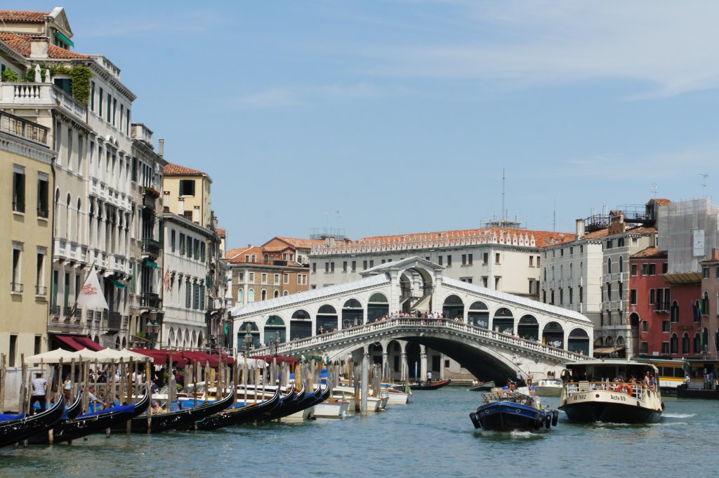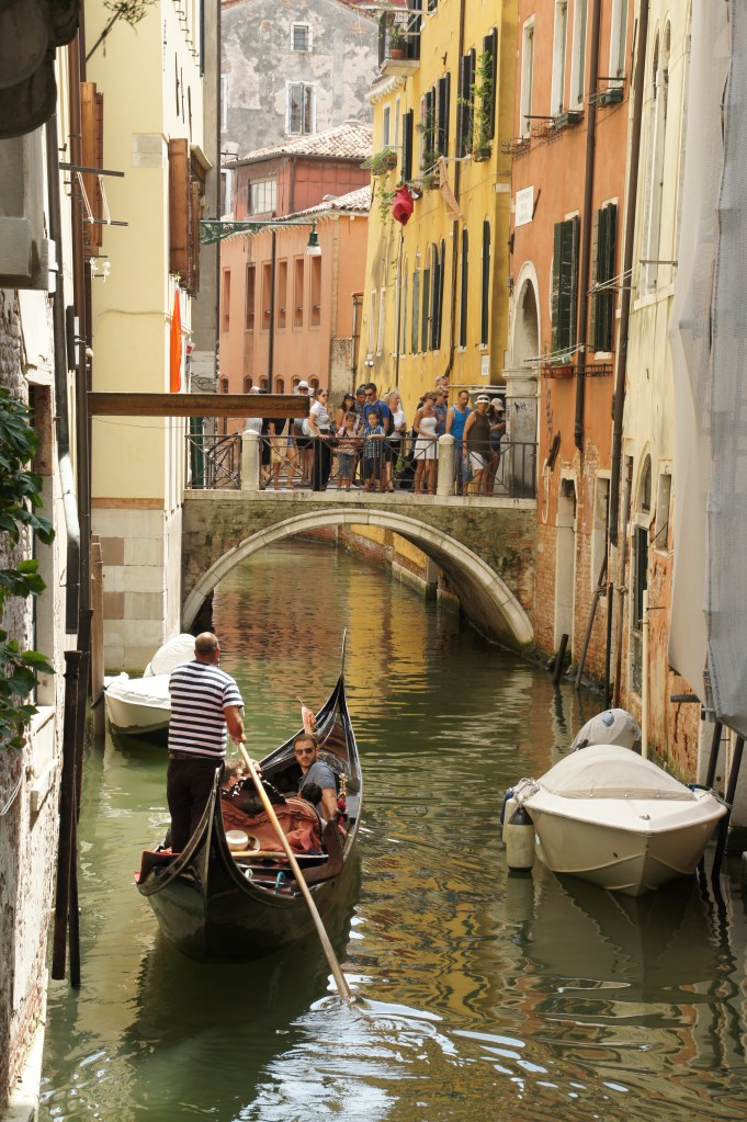 Venedig ist aber auch ruhig und romantisch: Liebende und Touristen lassen sich in Gondeln durch die vielen Kanäle fahren, sie unterqueren unzählige Brücken auf denen Fußbänger beim Bummel durch enge und romantische Gassen dem Treiben auf dem Wasser zusehen.