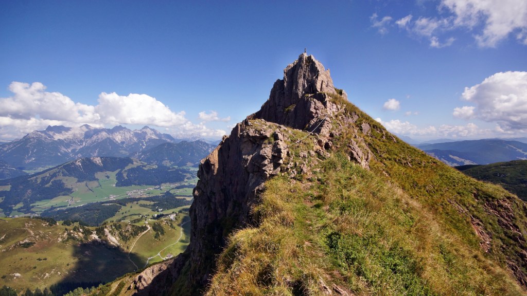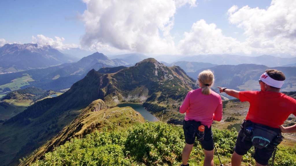 Fast, weil auf dem Weg ein reizvolles Hinweisschild zum Marocker zeigt: „10 Minuten“ kann man dort lesen, ein einfacher Weg, der nur auf den letzten Metern ein bisschen herausfordernd wird: Für den Anstieg zum 2019 Meter hohen Gipfel wurden zur Sicherheit Stahlseile gespannt, sie sind durchaus hilfreich, der Weg ist nicht ganz einfach – aber gut machbar. Und wieder werden die Gipfelstürmer mit einer faszinierenden Aussicht belohnt, insbesondere das Pillerseetal ist gut einzusehen und auch der Blick in die Region der Leoganger Steinberge wird nicht versperrt.